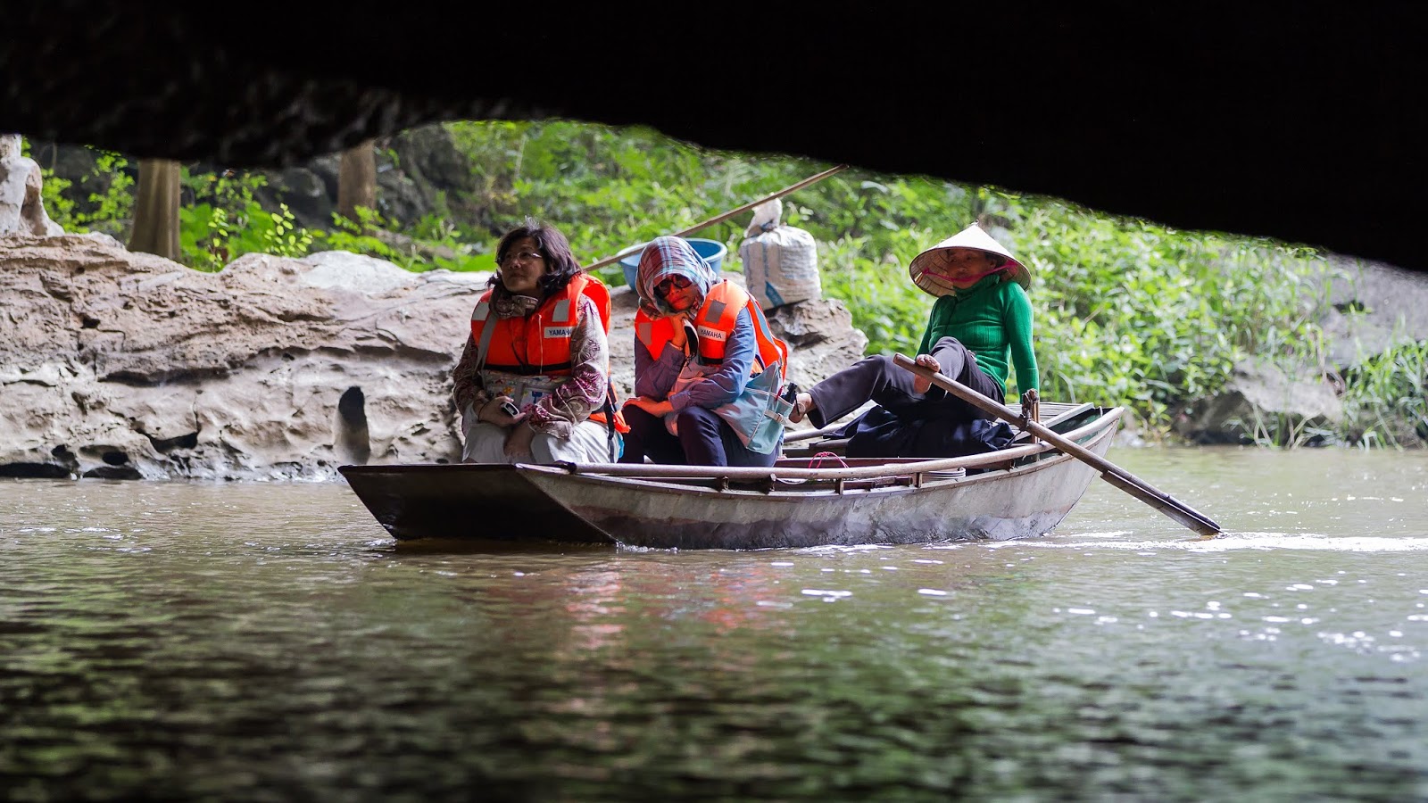 All the boats meander through limestone dumpling-shaped karst hills in a flooded landscape where the river and rice paddies merge visibly almost into one and at the end of the ride are three long, dark tunnel-caves.